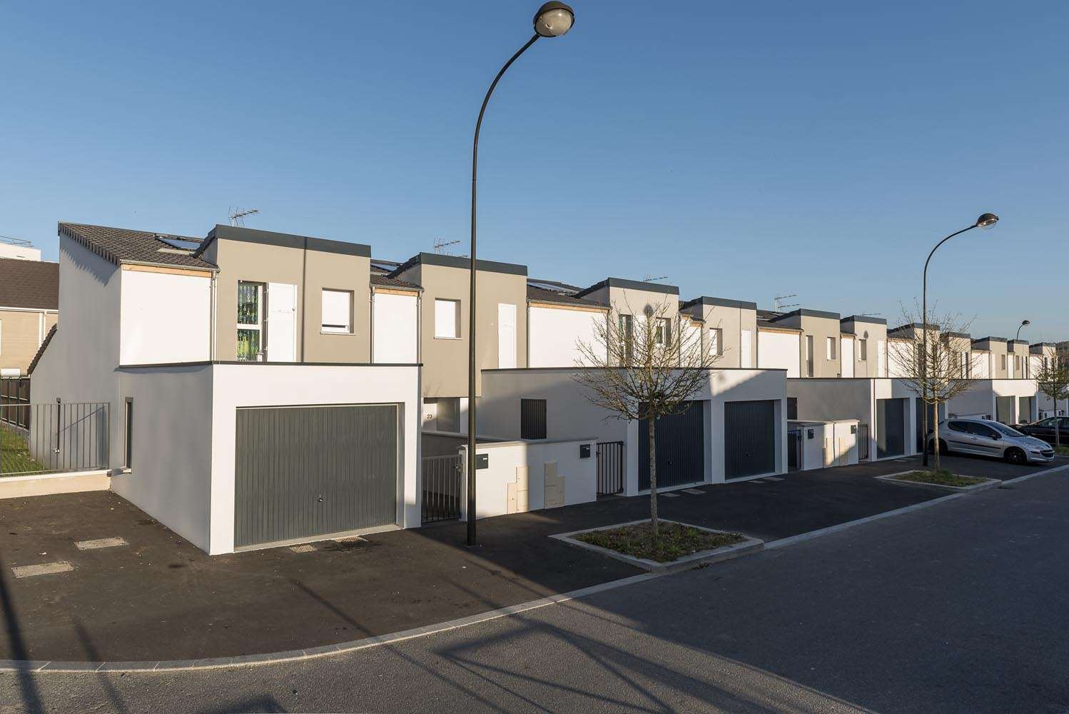 Ainsi, chacune des 14 maisons individuelles de l’îlot 7 s’organise sur 2 trames perpendiculaires à la rue : l’une de 6.20 sur 2 niveaux, l’autre de 2.80 m de plain pied.