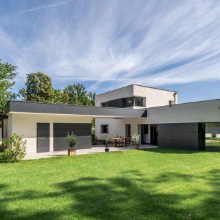 Pour compenser l’orientation Nord/Est, la hauteur de façade du séjour sur jardin est réduite. De ce fait, l’ombre portée sur l’extérieur est réduite. Un éclairage zénithal permet en outre un ensoleillement de cette pièce à certaines heures. Des panneaux solaires complètent l’équipement.
