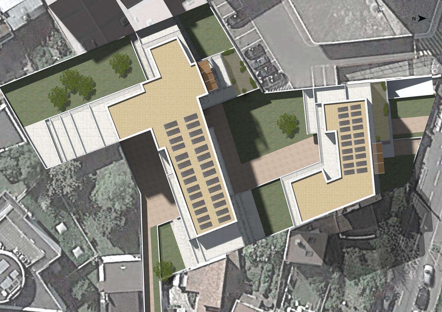 L’immeuble des logements en accession, d’une capacité de 41 logements, s’implante au cœur de l’îlot. En forme de croix asymétrique dont chaque branche se dégrade en terrasses privatives successives, il évite tout effet de pignons. Seule, la branche sud-ouest vient s’accoler volontairement au futur pignon R +4 de la parcelle 159. Ce principe minimise considérablement l’impact du futur bâti et réduit les ombres portées.