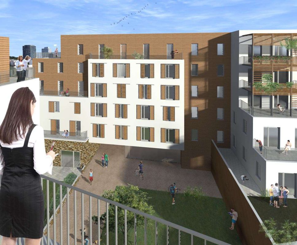 Au niveau du rez-de-chaussée, le plan dégage un large passage sous les branches nord-est et sud-est. Ainsi les jardins communiquent d’une façade à l’autre, apportant une fluidité au sein de l’îlot. Les deux halls des immeubles, largement vitrés, contribuent à favoriser la transparence au travers de l’opération.