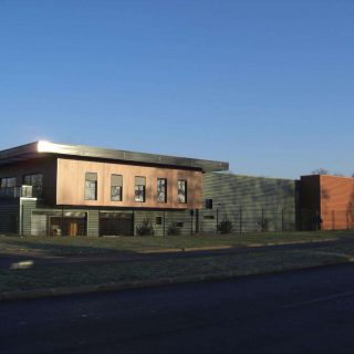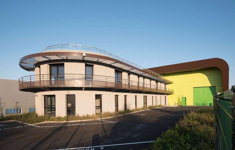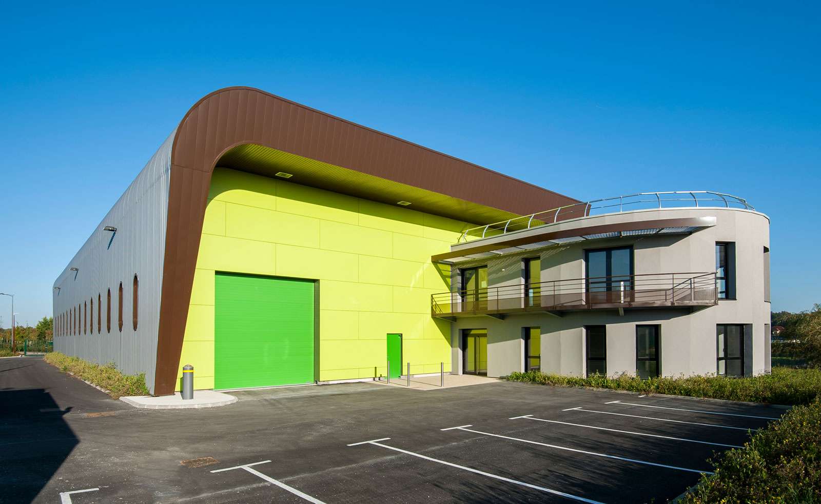 Deux bâtiments de bureaux sont disposés aux extrémités de l’entrepôt. Deux matériaux sont employés pour dessiner les façades. Le bardage métallique pour l’entrepôt et un enduit minéral pour les bâtiments de bureaux. Un coloris vert anis est utilisé ponctuellement pour signaler les entrées de l’entrepôt.