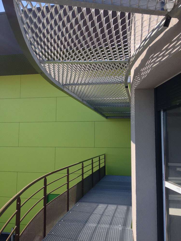 La façade SUD donnant sur la voie publique de la zone d’activités à fait l’objet d’une écriture architecturale particulièrement soignée. Les bâtiments de bureaux sont équipés d’un balcon en forme de bandeau qui fait office d’auvent et de brise soleil. Les garde-corps et les brises soleil sont en aluminium délimitent cette terrasse. Les accès à l’entrepôt sont protégés par des auvents dont les faces extérieures sont soulignées d’un coloris ocre (RAL 8001).