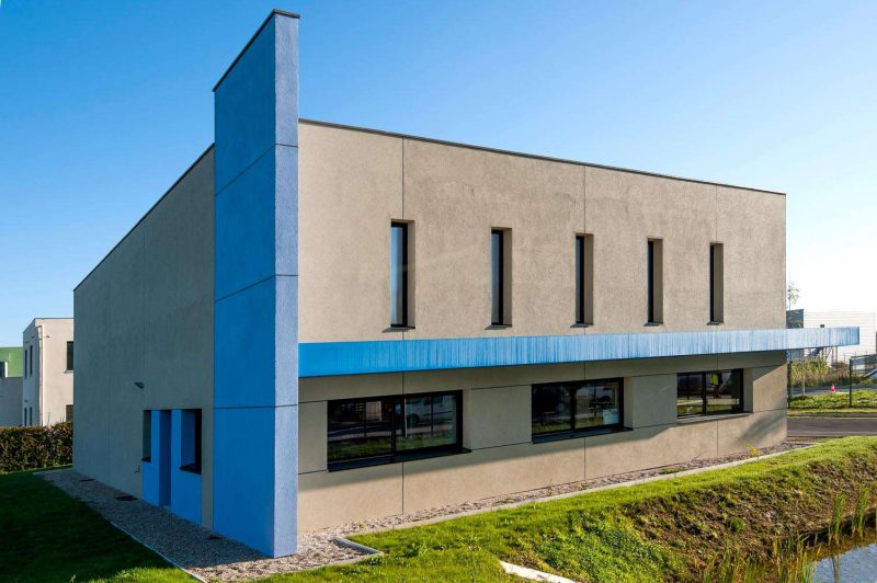 Une bande de brises soleil colorée vient protéger la partie bureaux et se termine en auvent pour marquer et abriter les accès principaux, tout en soulignant l’enseigne du bâtiment. Un imposant mur vertical et coloré s’élance comme un repère dans l’environnement proche et lointain du bâtiment.