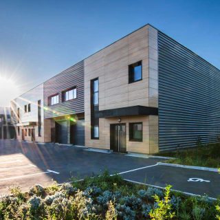 Le bâtiment se compose de deux espaces principaux : des bureaux au Sud et un grand entrepôt au Nord. Cette organisation se reflète à l’extérieur par de vastes ouvertures au niveau de la zone bureaux et une façade presque opaque pour la zone entrepôt qui vient chercher une lumière zénithale permettant ainsi de garder une masse volumétrique imposante qui vient donner de la stature au bâtiment qui s’ancre sans retenue à son site.