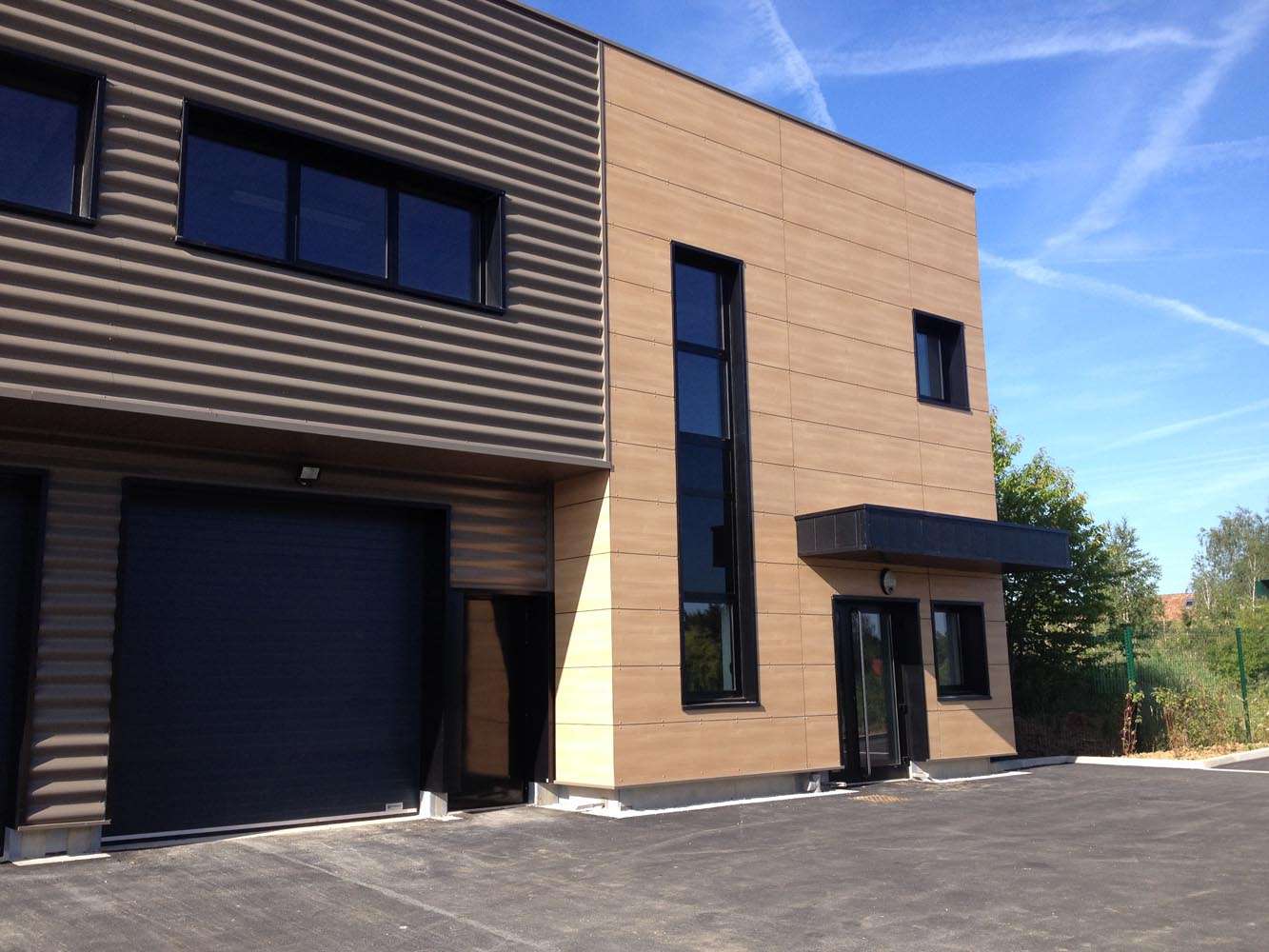 Le bâtiment est composé de trois cellules, comprenant chacune une zone bureaux et une zone d’entrepôts. Les bureaux au Nord, accessibles directement depuis les voies de dessertes et les espaces de stationnements automobiles. Les entrepôts au Sud. Cette organisation permet de traiter une façade noble visible depuis la voie publique. Cette implantation se caractérise par des traitements de matériaux différents entre les bureaux et les entrepôts. Les bureaux se distinguent par de vastes ouvertures et un bardage composite à l’aspect bois. Quant aux entrepôts ceux-ci sont habillés par un bardage métallique horizontal.