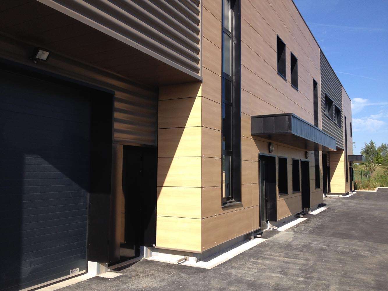 Des auvents viennent protéger les entrées des parties bureaux. Les entrées des entrepôts sont dessinées en recul par rapport au reste de la façade du bâtiment, ainsi les zones de stockage de l’étage abritent ces accès.