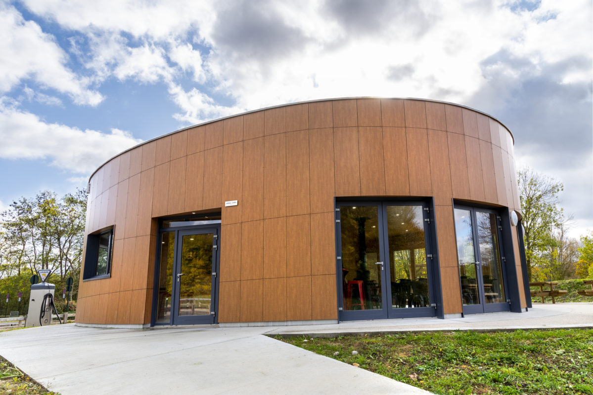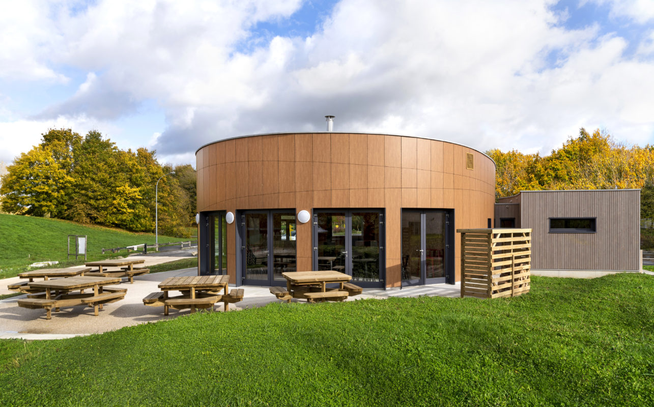 Ce bâtiment, de forme ellipsoïdale, d’une surface plancher d’une centaine de m², abritera une salle destinée à la petite restauration. Un bar avec office et réserve complète l’équipement.