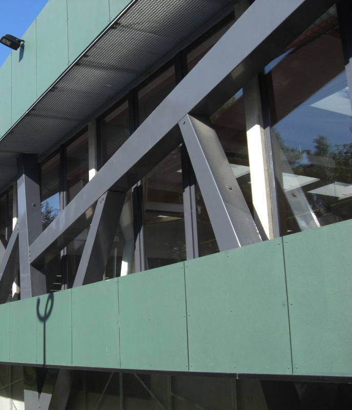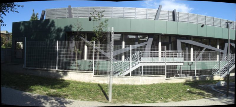 -d’une part, les sections réservés aux sports, en particulier le Dojo qui s’ouvre largement sur la partie piètonne de la rue Lamartine, légèrement en surplomb. La structure porteuse est reportée sur la façade extérieure, libérant ainsi de tout obstacle l’aire des tatamis. Tels des pictogrammes représentant les art martiaux, cette structure métallique reprend les mouvements, tensions, les équilibres et déséquilibres des sports de combats.
