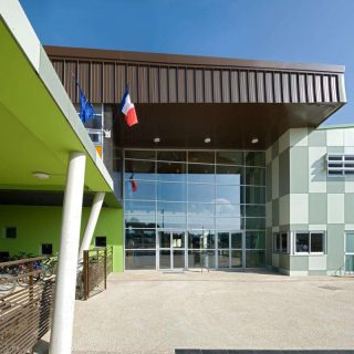 Il valorise l’importance de l’équipement (la hauteur du bâtiment à son faîtage est de 7,70 mètres). Il permet d’offrir la perception depuis le domaine public de l’animation des salles de musiques largement vitrées, situées au 1° étage. Enfin, c’est l’occasion de concevoir un hall sur deux niveaux, véritable lieu de rencontre autour du socle de l’escalier traité en gradins et distribuant ainsi un équipement plus compact et plus animé.
