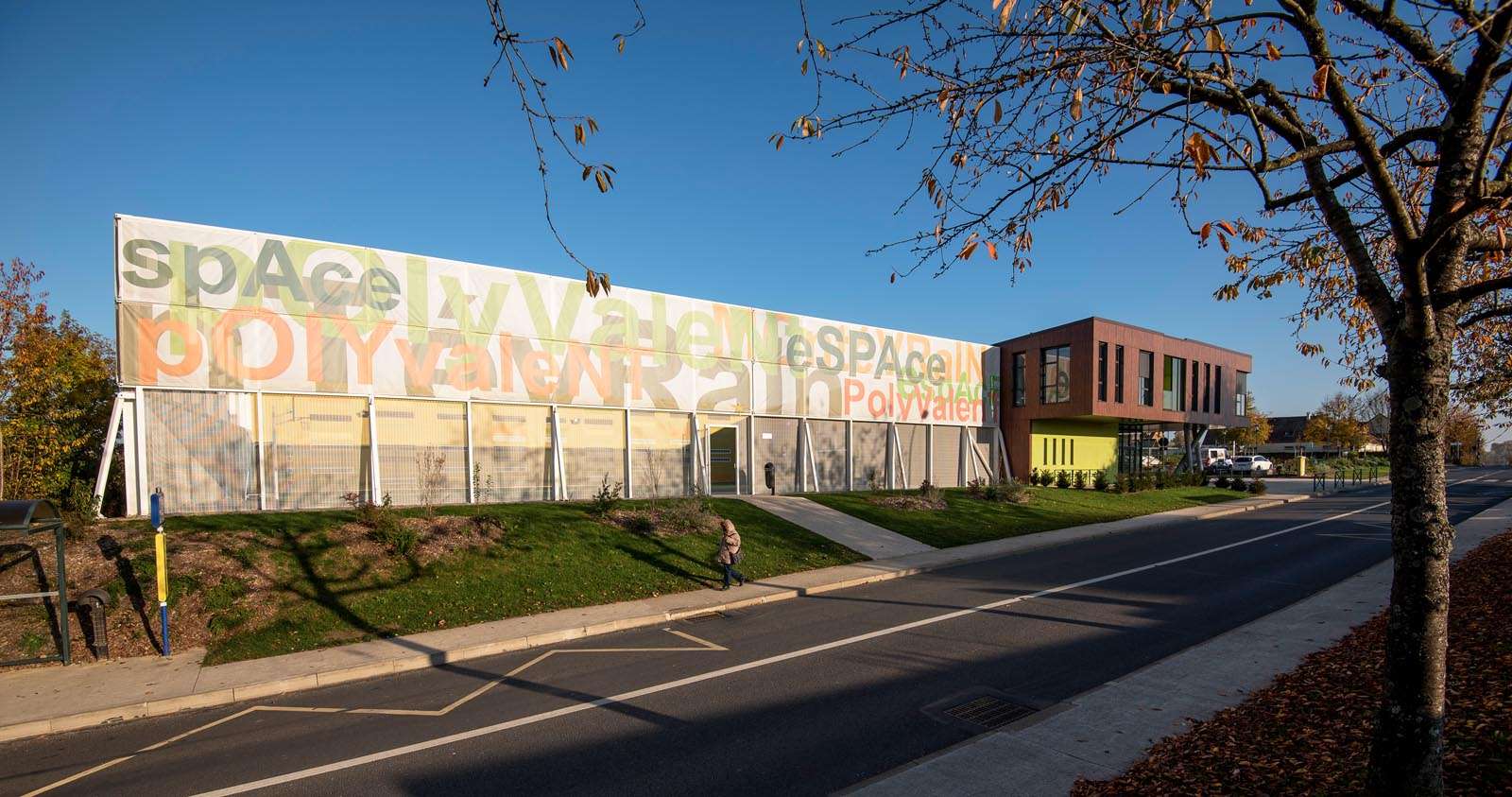 Le volume construit, monolithe en forme de L, regroupe les 4 espaces du programme.