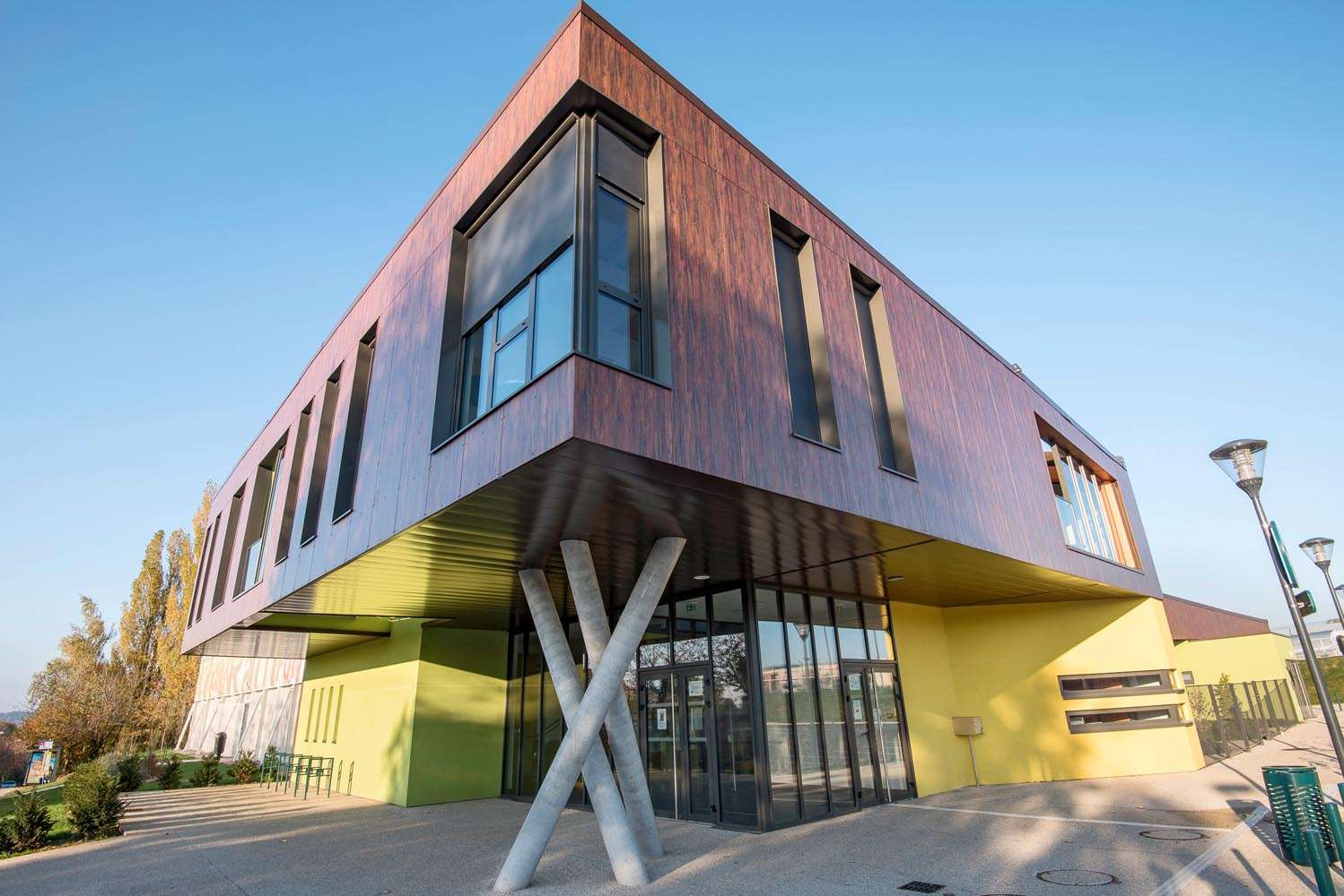 Le parvis marque l’entrée de l’espace associatif et de l’espace jeunes. Cet espace d’accueil est largement protégé par l’étage en porte à faux, volontairement important, et en relation directe avec l’aire de stationnement.