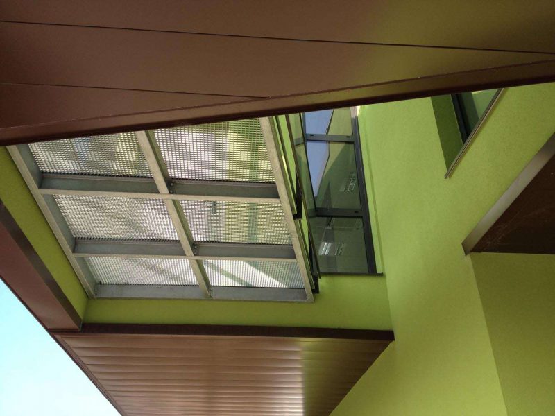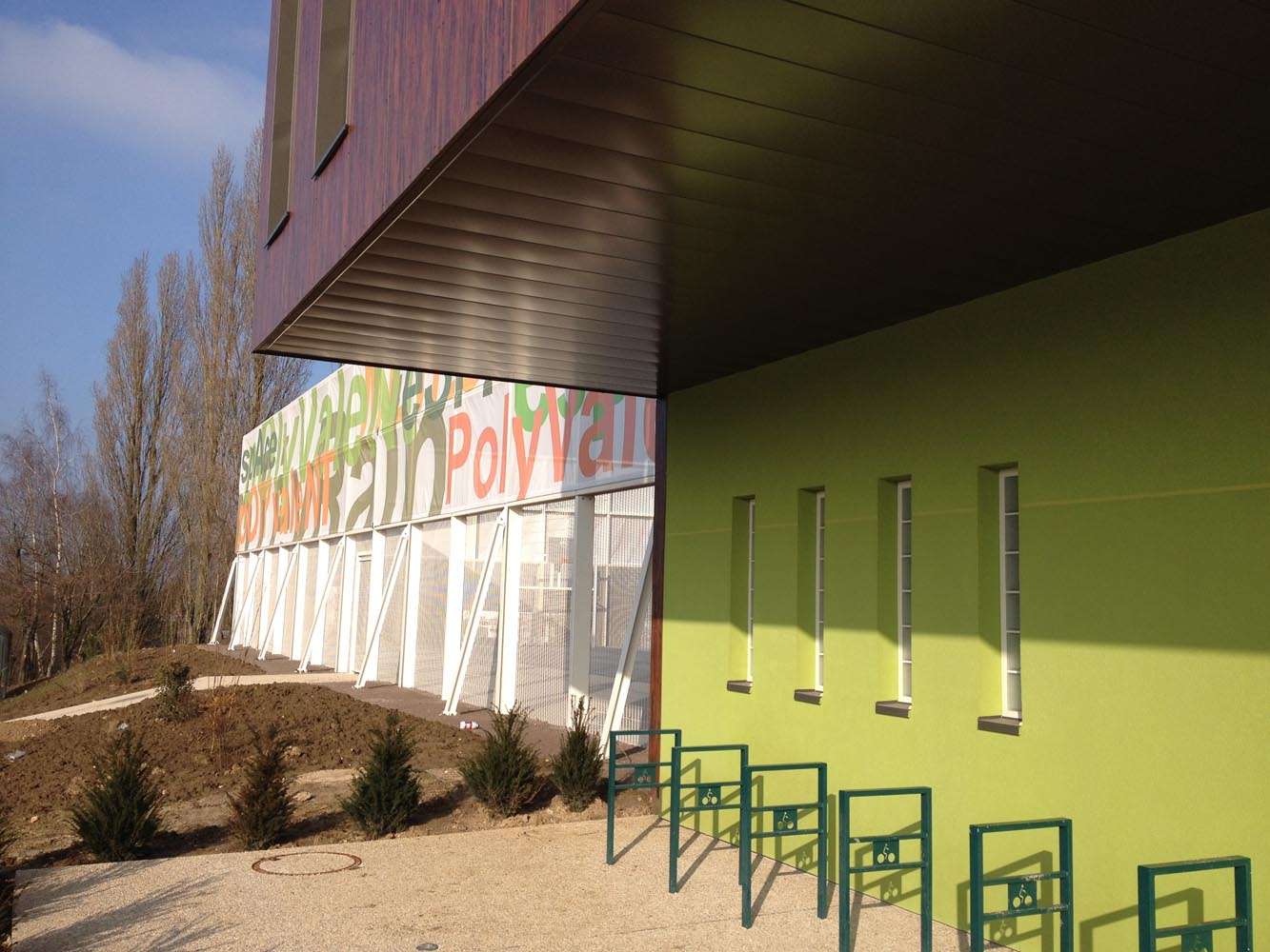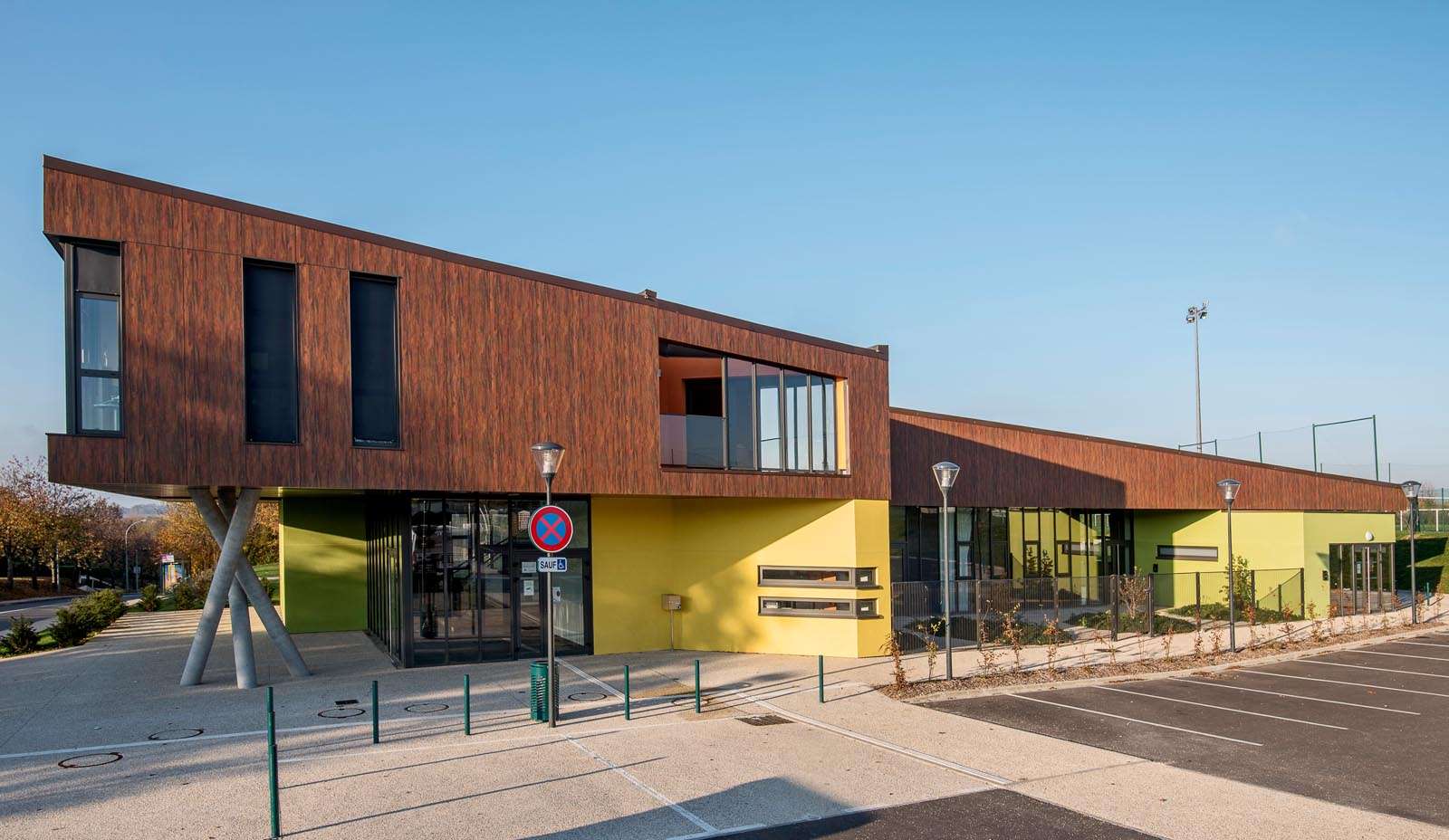 Le city-stade, inclus dans le «L» du bâtiment, participe à la volumétrie générale, grâce à son système de clôture constitué sur 3 mètres de hauteur d’une grille rigide à mailles horizontales, que couronne une membrane tendue et peinte, de 3 mètres de haut, faisant office de pare ballon, et dont les motifs imprimés annoncent la vocation du lieu.