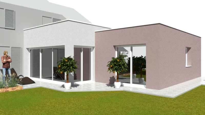 La nouvelle construction contient un cellier avec entrée de service, une salle à manger, un WC, une chambre avec salle d’eau. La salle d’eau est équipée d’un châssis fixe au vitrage opacifiant sur sa partie basse et d’un châssis à soufflet au vitrage opacifiant sur sa partie haute.