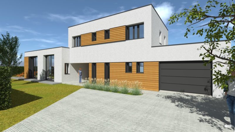 Cette maison au caractère contemporain est traitée avec des toits plats n’excédant pas 10 mètres à l’acrotère, minimisant ainsi la hauteur du bâtiment. Elle est composée d’un étage partiel.