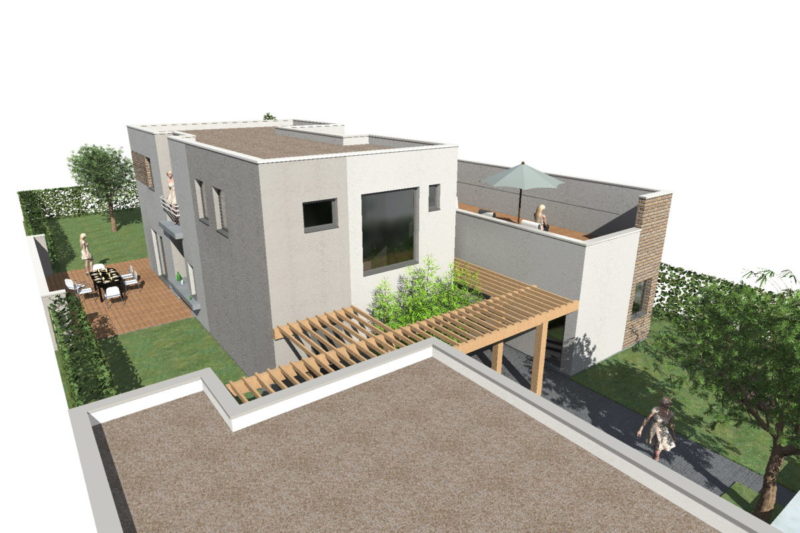 La toiture terrasse est accessible par le biais d’un escalier extérieur situé côté jardin ou par le 1er étage du deuxième volume.