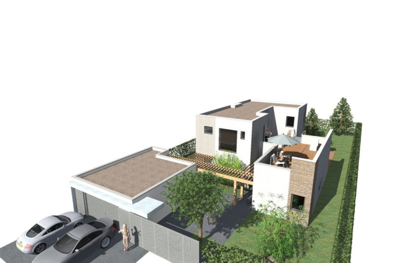 La construction s’organise autour d’un patio. Deux volumes distincts ferment l’espace de vie extérieur. A l’est, un premier volume est composé d’un niveau rez-de-chaussée (chambre parents, dressing, salle d’eau et bureau) et d’une toiture terrasse accessible. Ce bloc est volontairement bâti d’un étage afin de laisser pénétrer le soleil au coeur du patio.